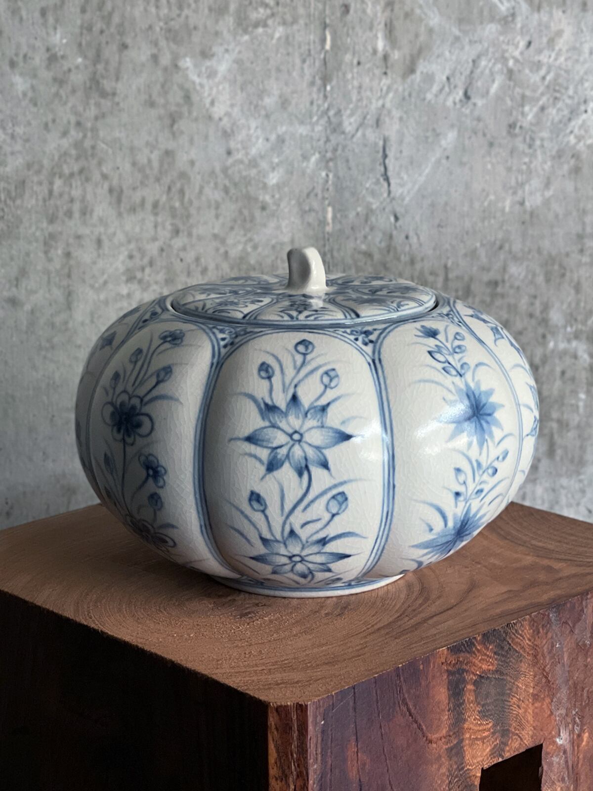 8面に美しい草花が描かれた、カボチャ型の蓋付きポットです。