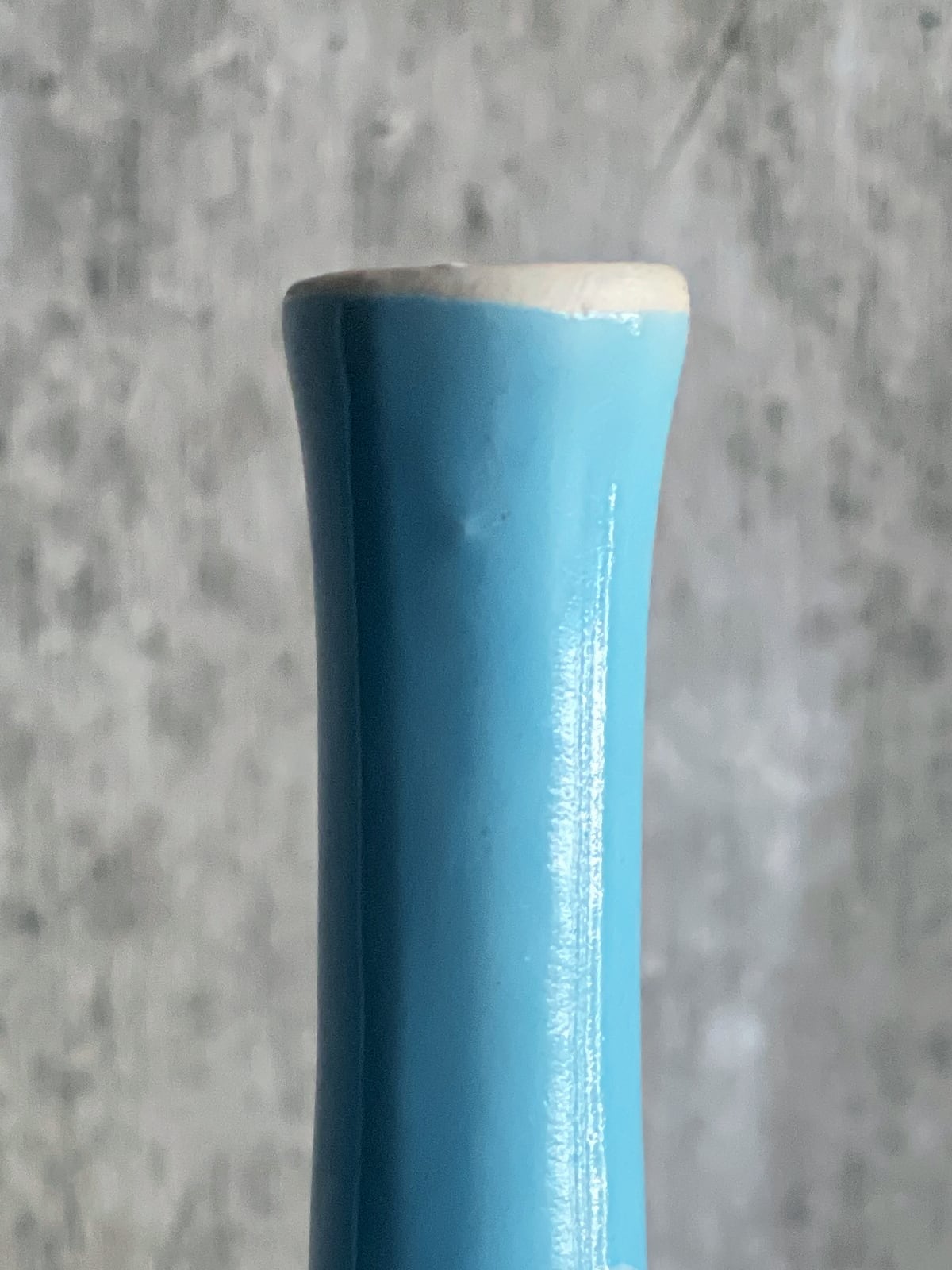 美しいターコイズブルーに、手書きの花が描かれた一輪挿しです。