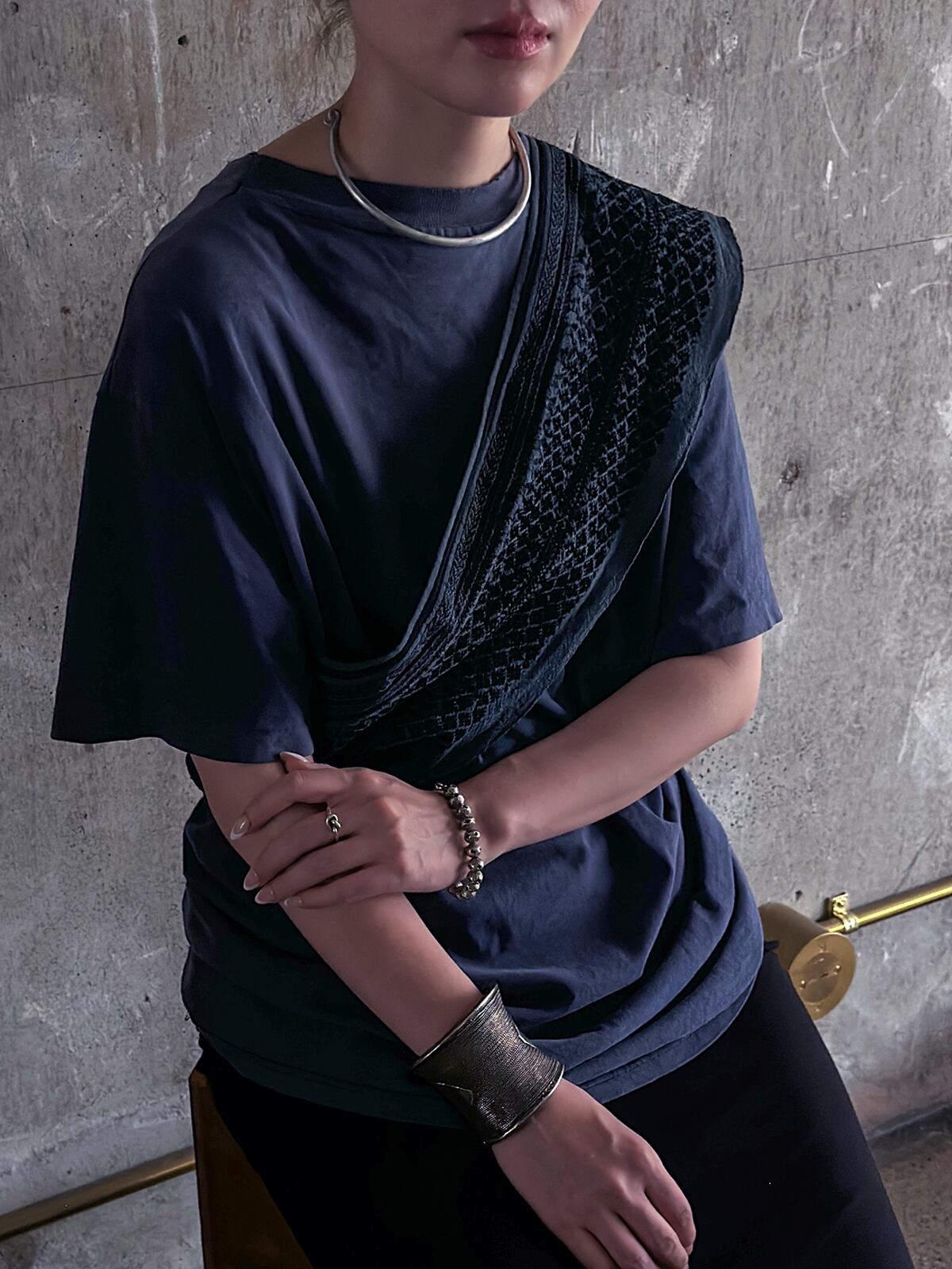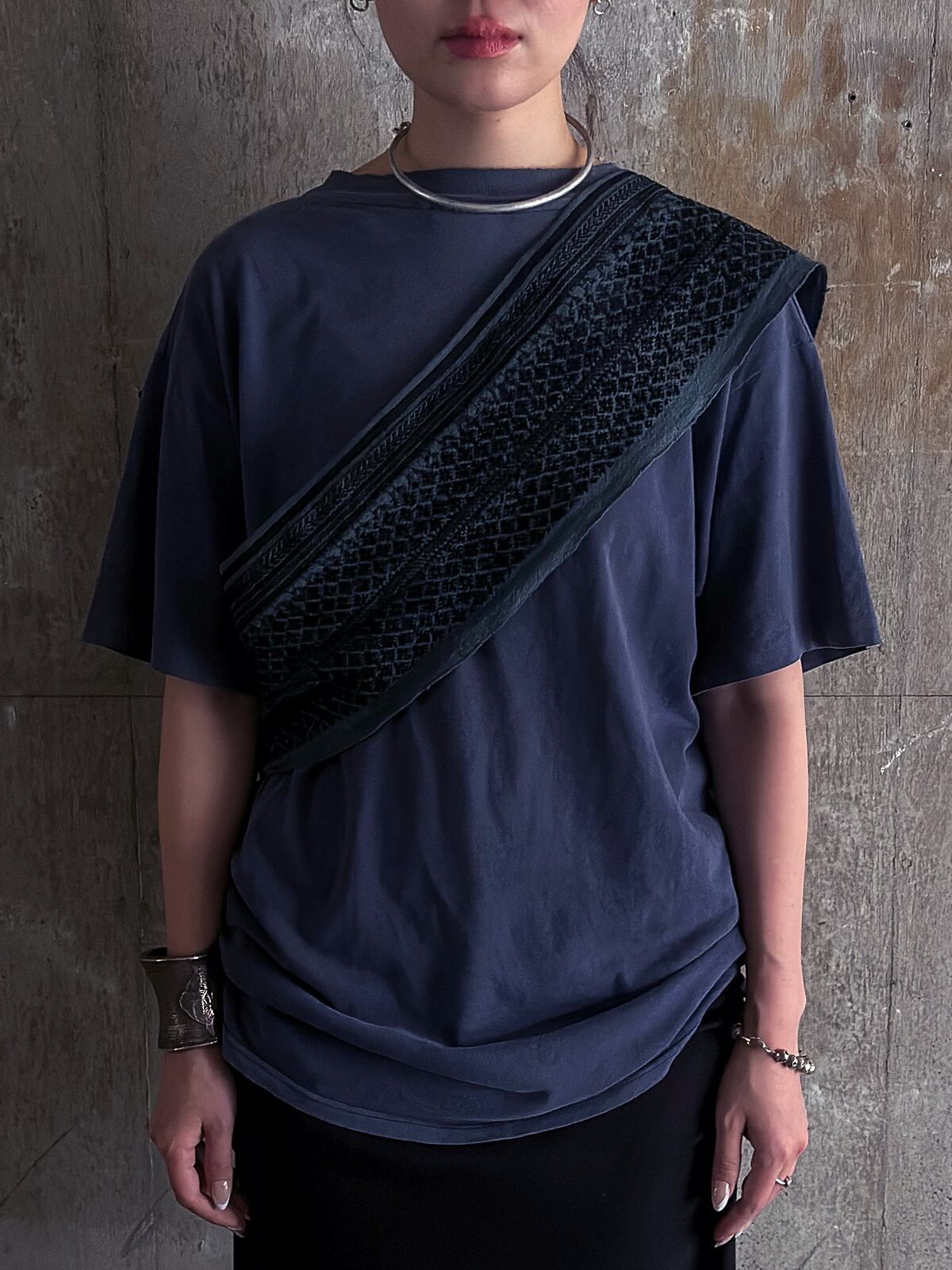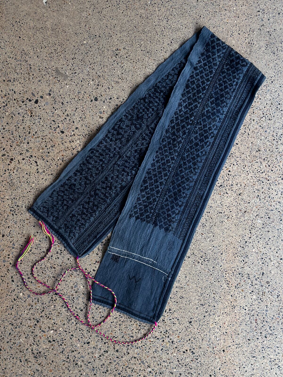 使用していたヴィンテージの刺繍ファブリックをtay originalで黒染めを施しました。