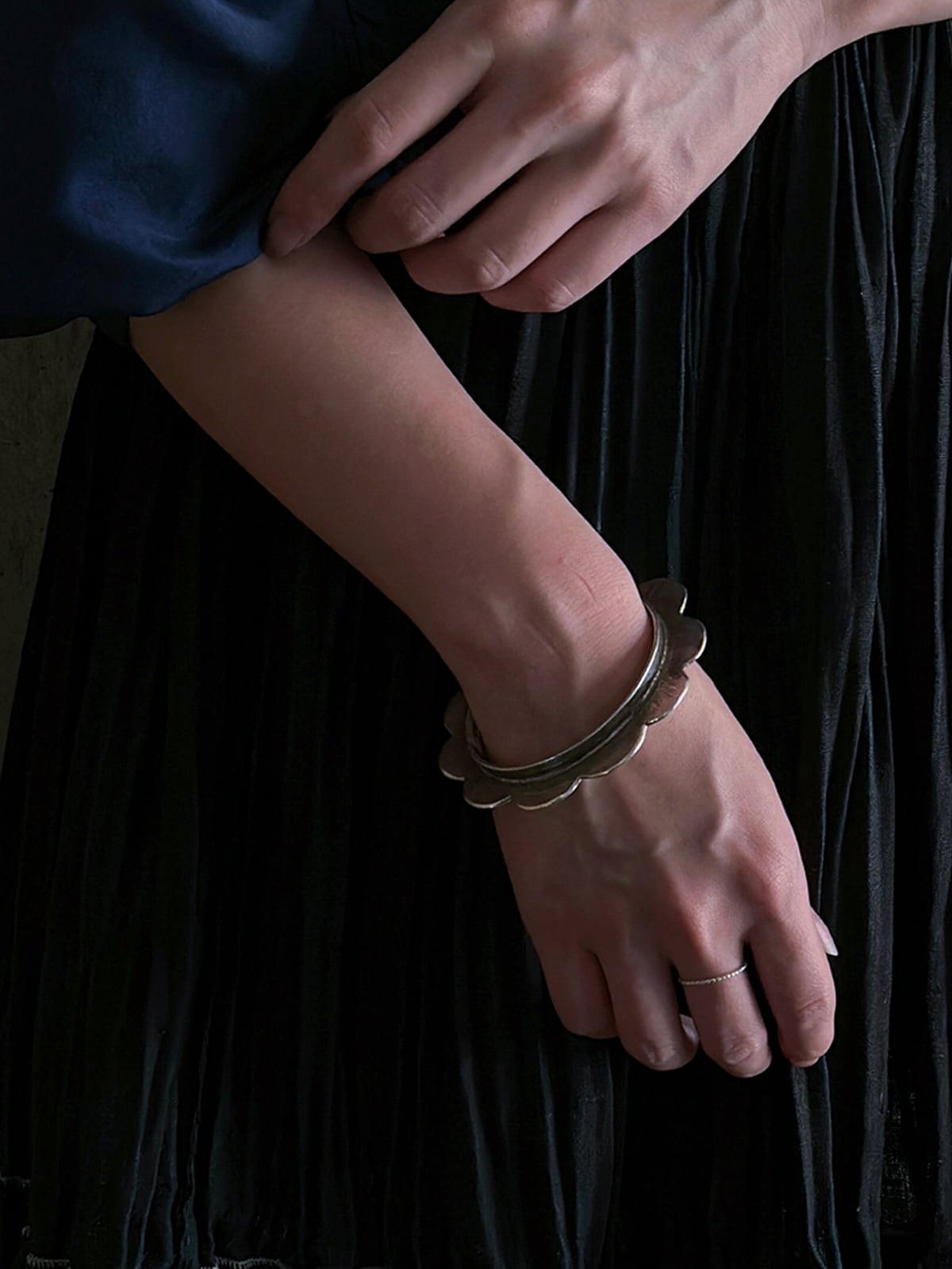 手打ちの無骨な質感が可愛らしすぎず、モダンな装いにも華を添えてくれます。