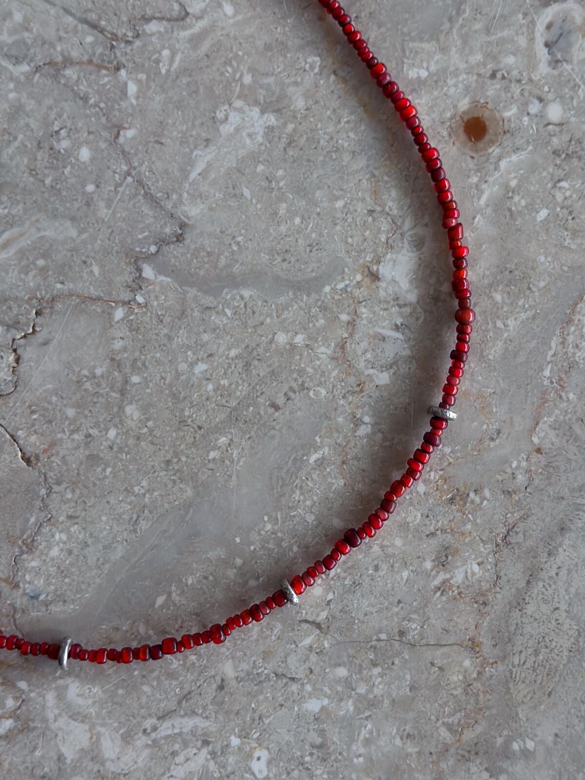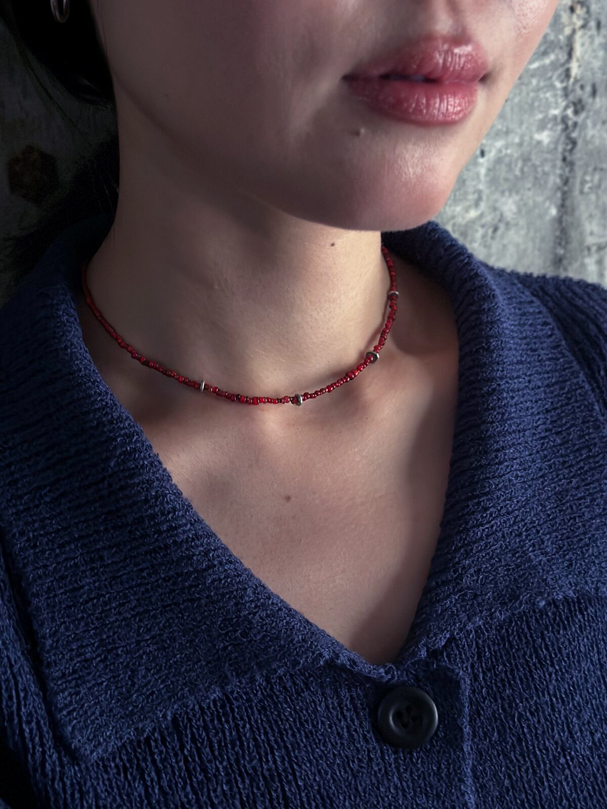 深みのある赤とシルバーが首元をモダンに彩ります。