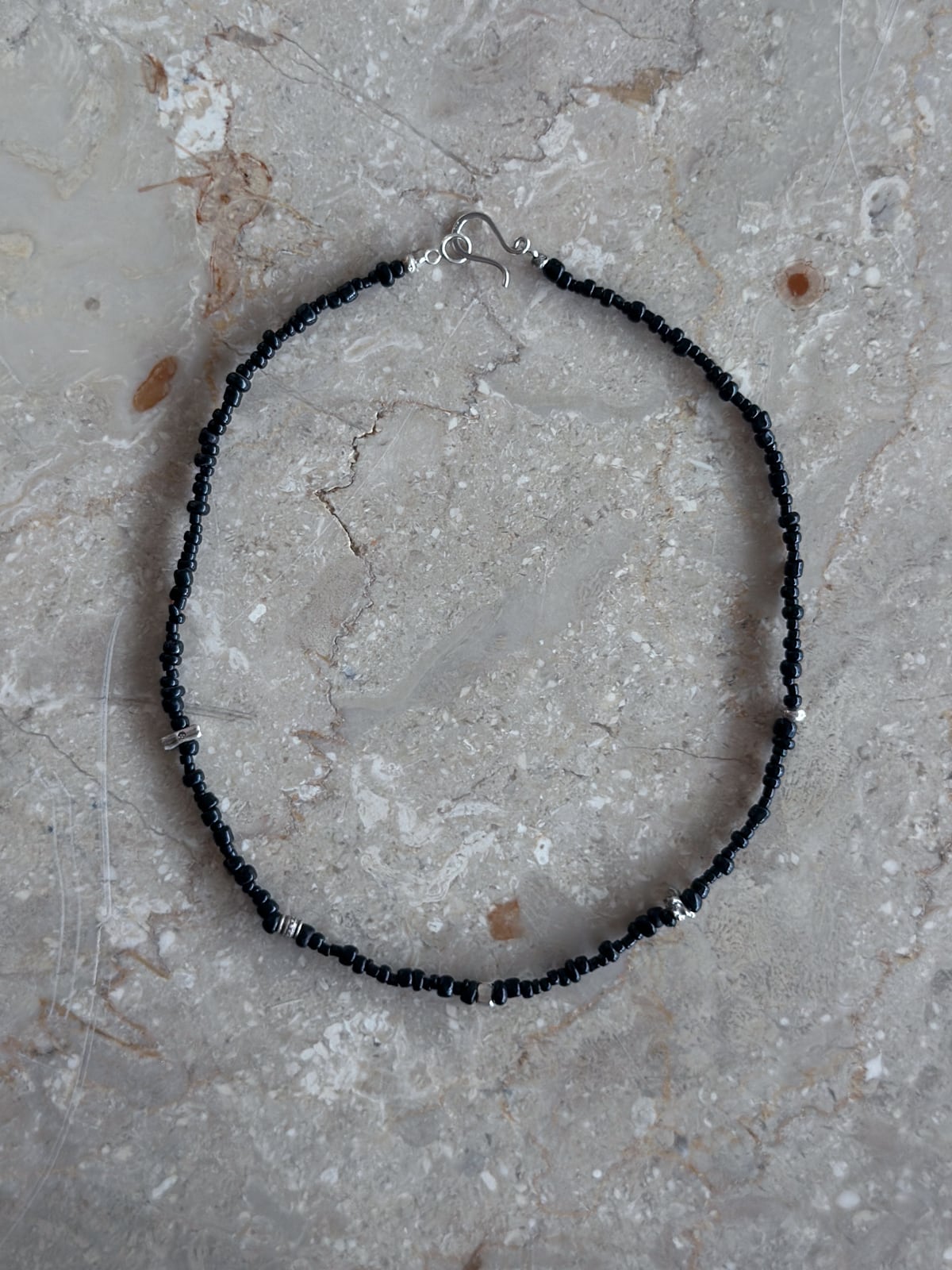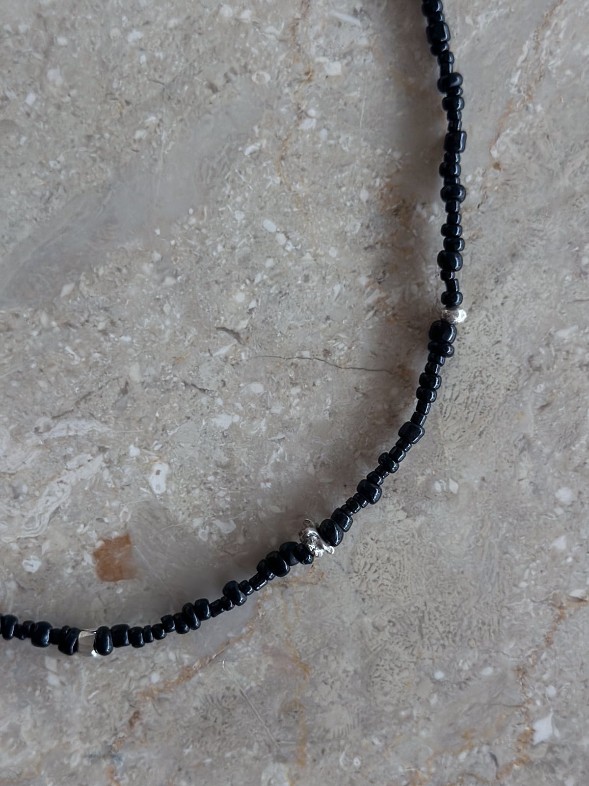 大小の織りなすビーズの粒が首元をモダンに彩ります。