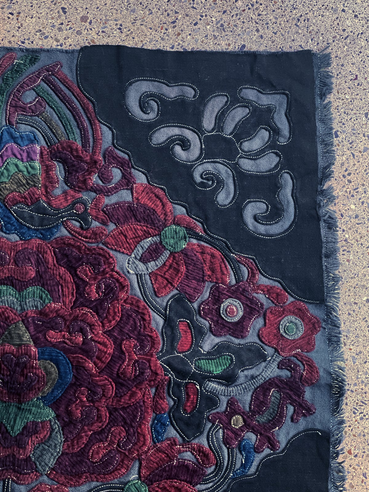 コーデュロイ生地のアップリケで花や鳥が描かれています。