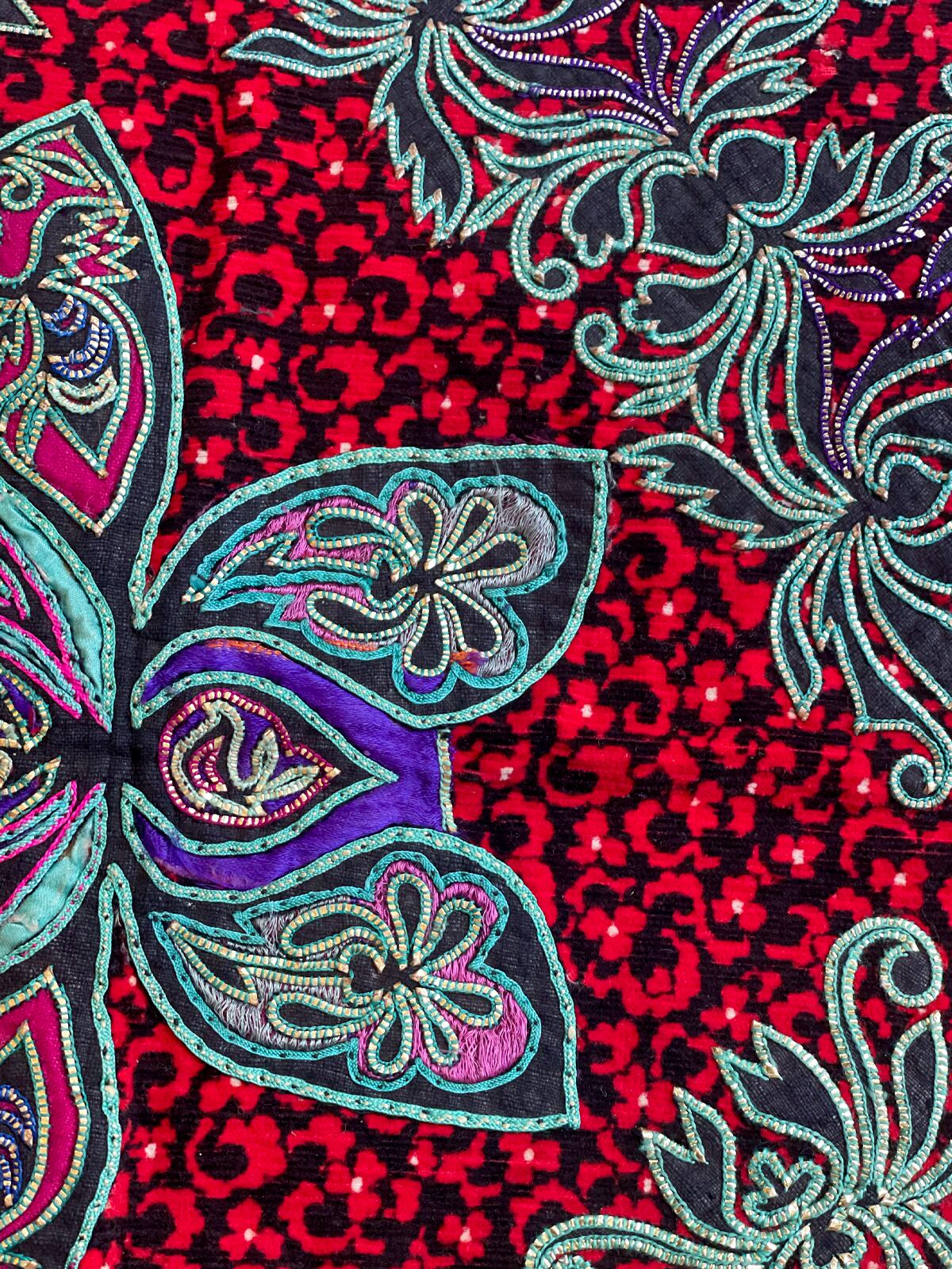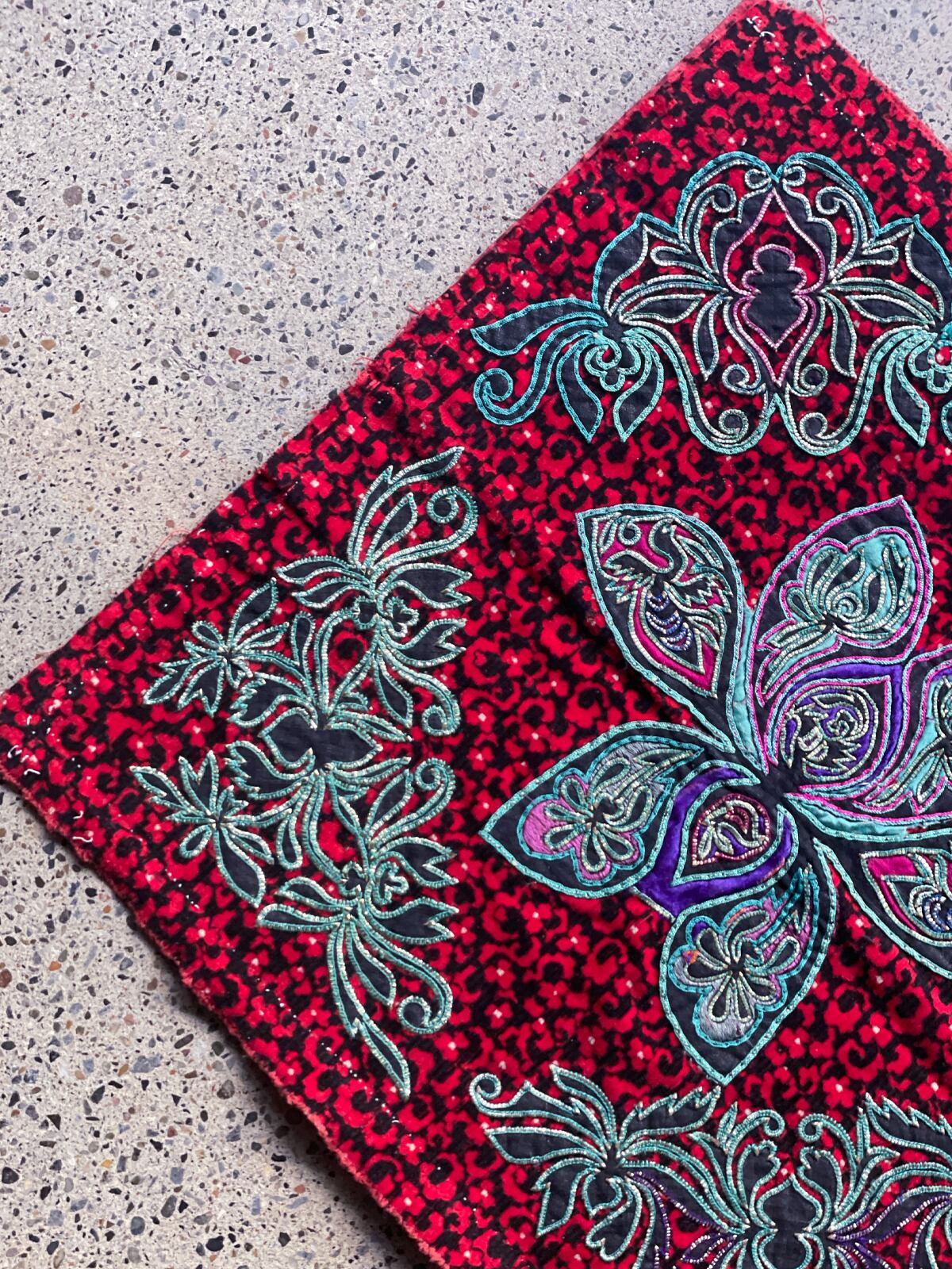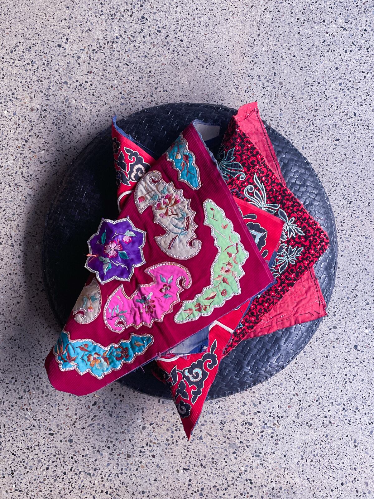 コーデュロイ生地にアップリケや、伝統的な刺繍「錫繍」の技術を用い、美しい模様を描いています。