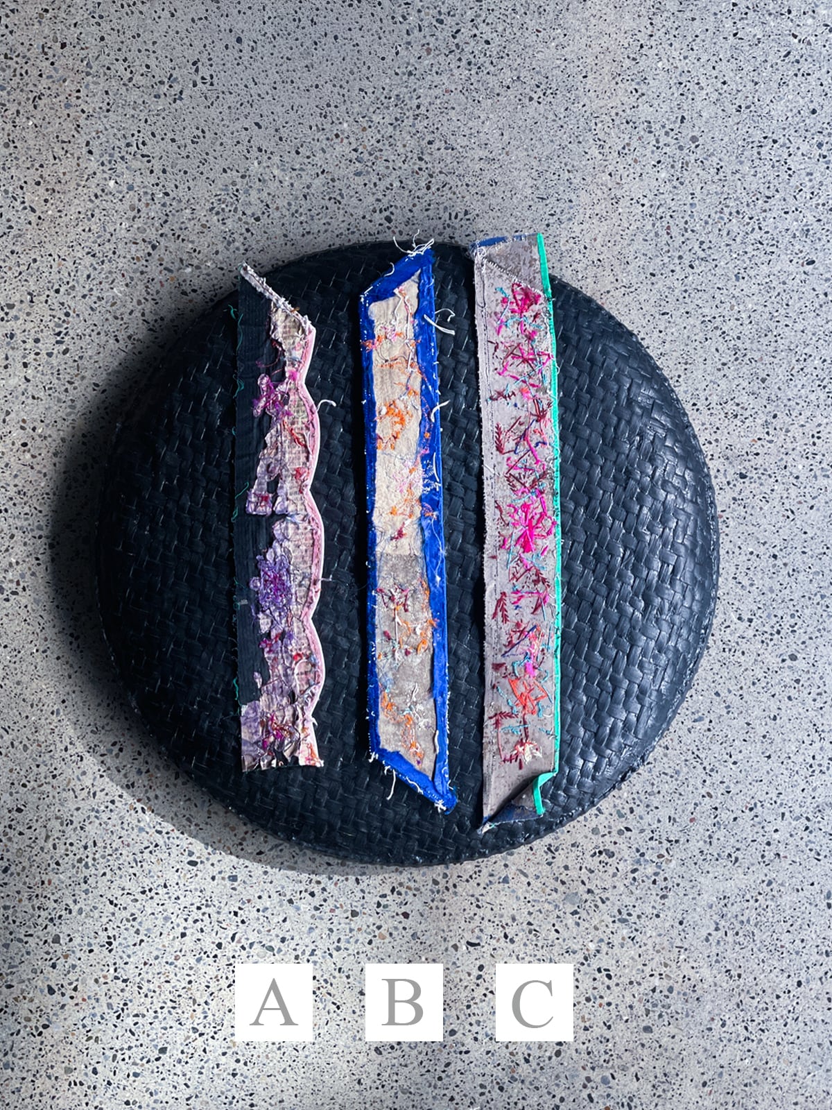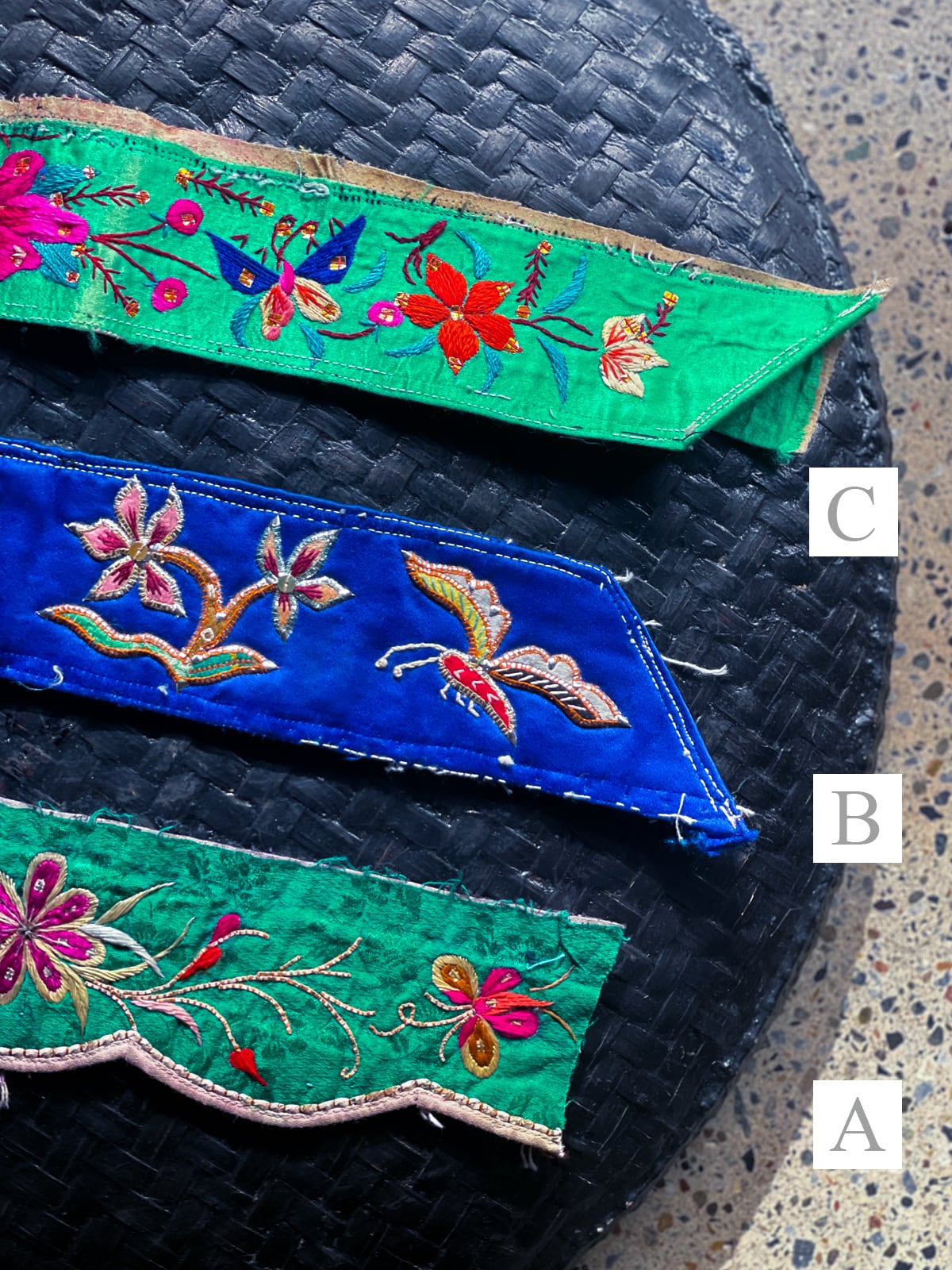 草花などの刺繍と、伝統的な「錫繍」の技術を用い、美しい模様を描いています。