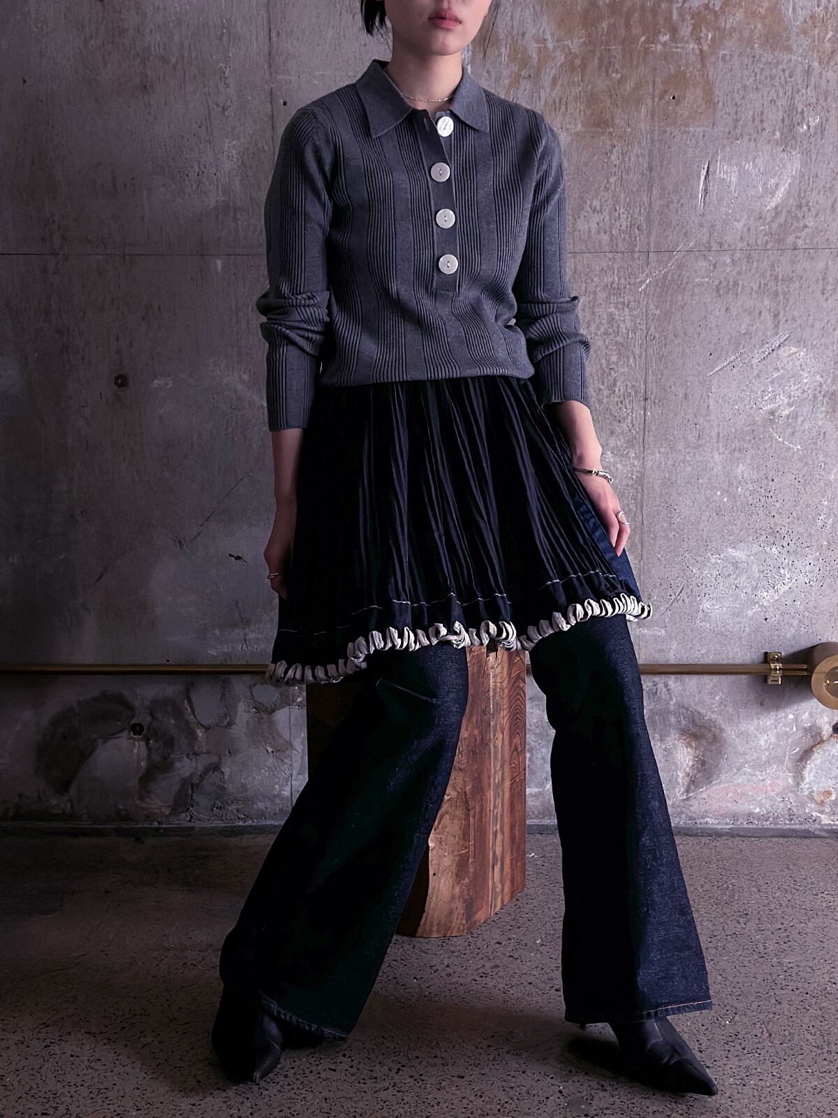 デニムなどをはじめ様々なボトムスにレイヤードできるためコーディネートの幅が広がります。