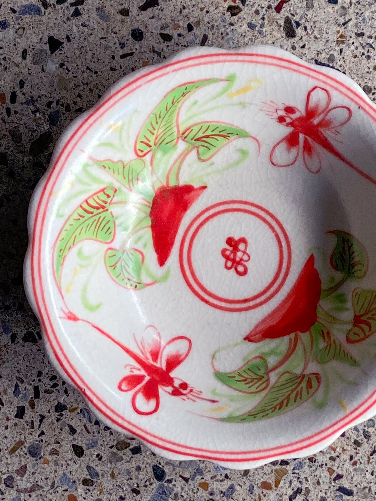 「バッチャン焼き」の少し深さのある、トンボ柄の絵付けの小皿です。