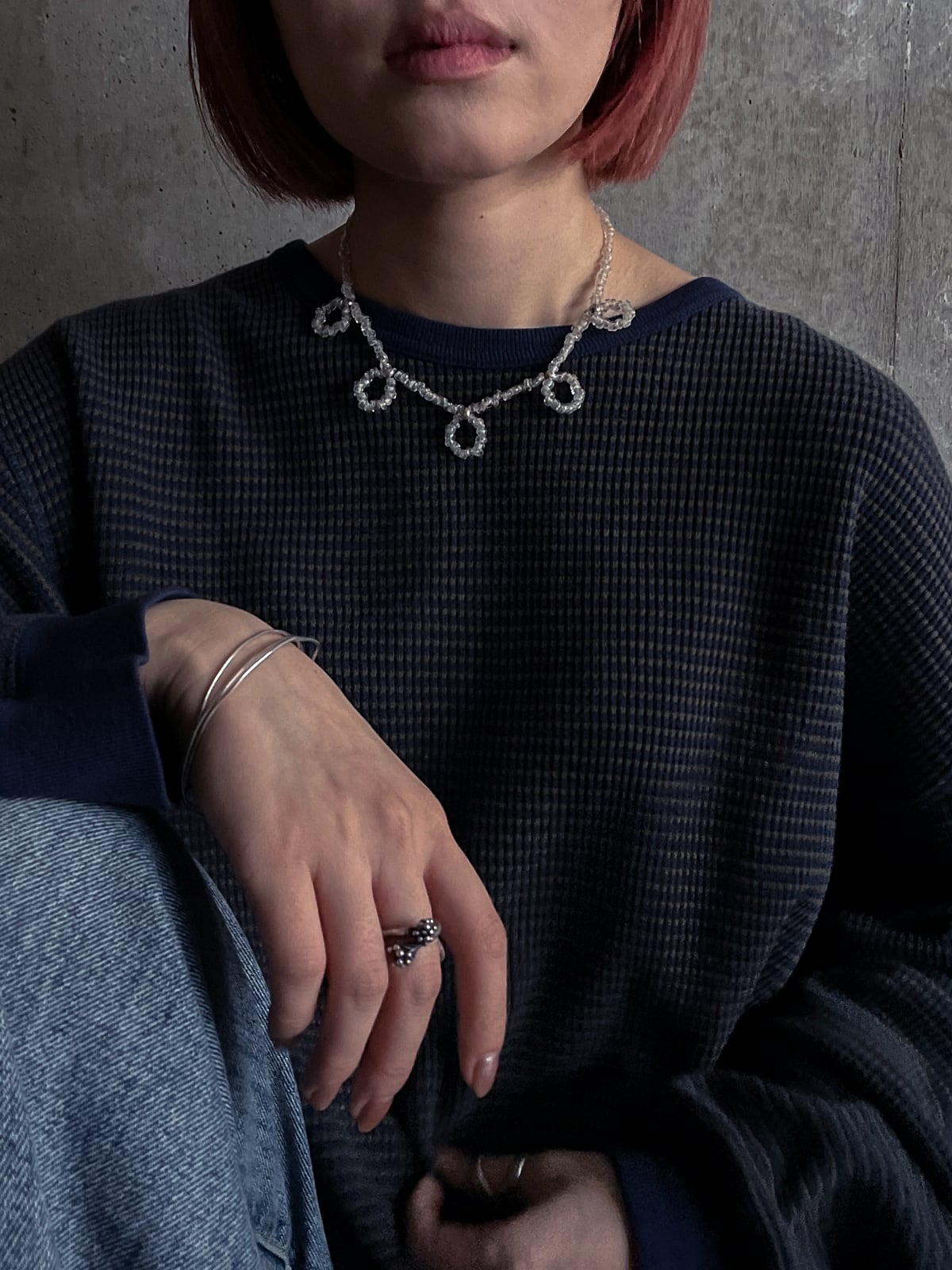 ヴィンテージのビーズとシルバーパーツを組み合わせた333オリジナルのネックレス。輪っかが連なったデザインは、シンプルなTシャツなどに合わせていただくだけでコーディネートのアクセントに。